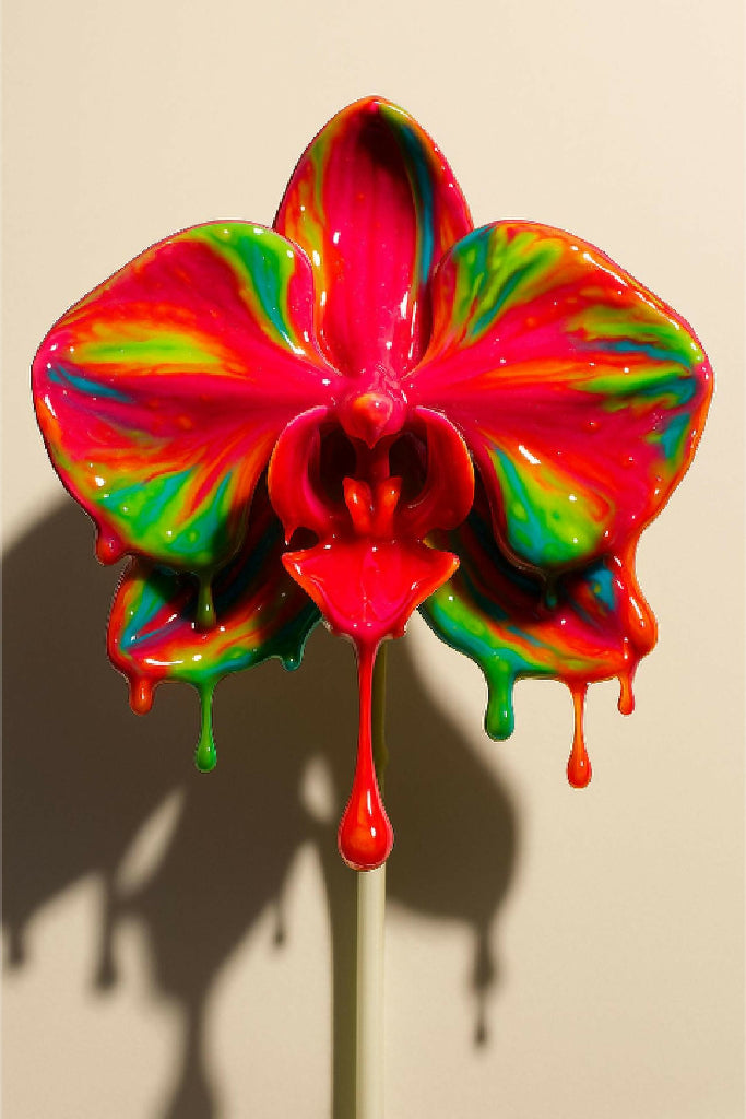 A surreal orchid suspended between bloom and melt, its petals awash in molten neon, as if hand-dipped in liquid technicolor. Viscous streams of electric pink, jungle green, sun-gold, and cosmic blue ooze from each fold, defying nature and paint alike. Glossy, hypnotic, and impossibly alive.