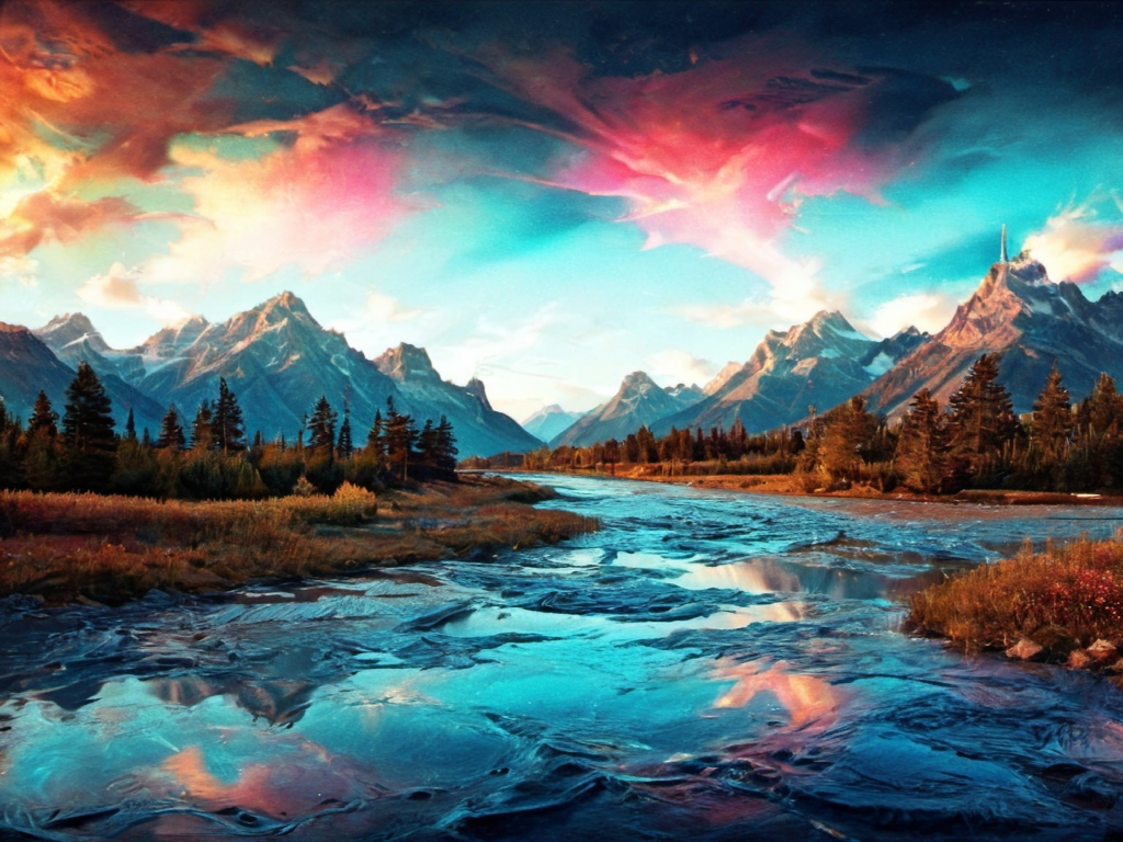 Obra de arte digital surrealista creada con inteligencia artificial. Representa un paisaje de ensueño con majestuosas montañas, un río cristalino y un cielo vibrante en tonos cálidos y fríos que evocan fantasía y emoción. Esta pieza única está diseñada para quienes buscan una decoración impactante y moderna, ideal para hogares, oficinas o colecciones de arte digital. Es una pieza de edición limitada y formará parte de una futura colección exclusiva de paisajes de ensueño. Resolución de alta calidad, perfecta para impresiones y coleccionismo de NFT.