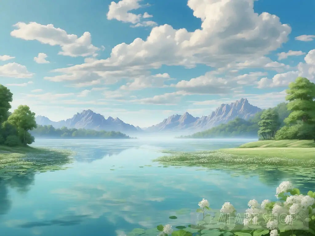 الطبيعةا لأبعاد: 1920 × 1080 بكسل الألوان: ألوان هادئة وناعمة ، مثل الأزرق الفاتح والأخضر الفاتح والأبيض النمط: لوحة واقعية التفاصيل: تفاصيل دقيقة للبحيرة والسحب والنباتات المعنى: السلام والهدوء والقفز