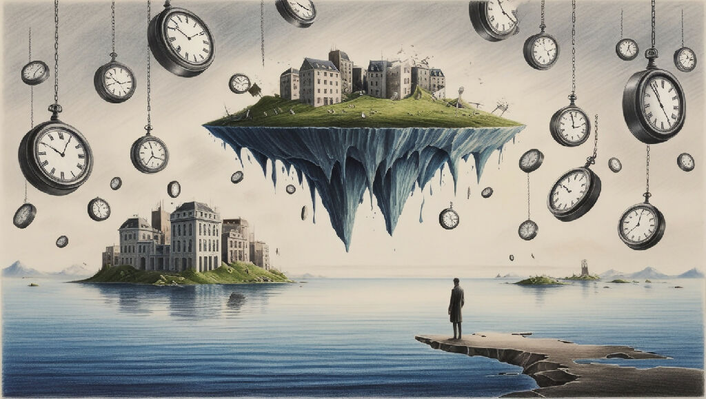 A surreal landscape where the laws of reality are bent and twisted. A floating island hovers above a calm sea, with upside-down buildings and impossible structures. The sky is filled with floating clocks, melting into each other, while a lone figure stands at the edge of the island, gazing at the horizon.