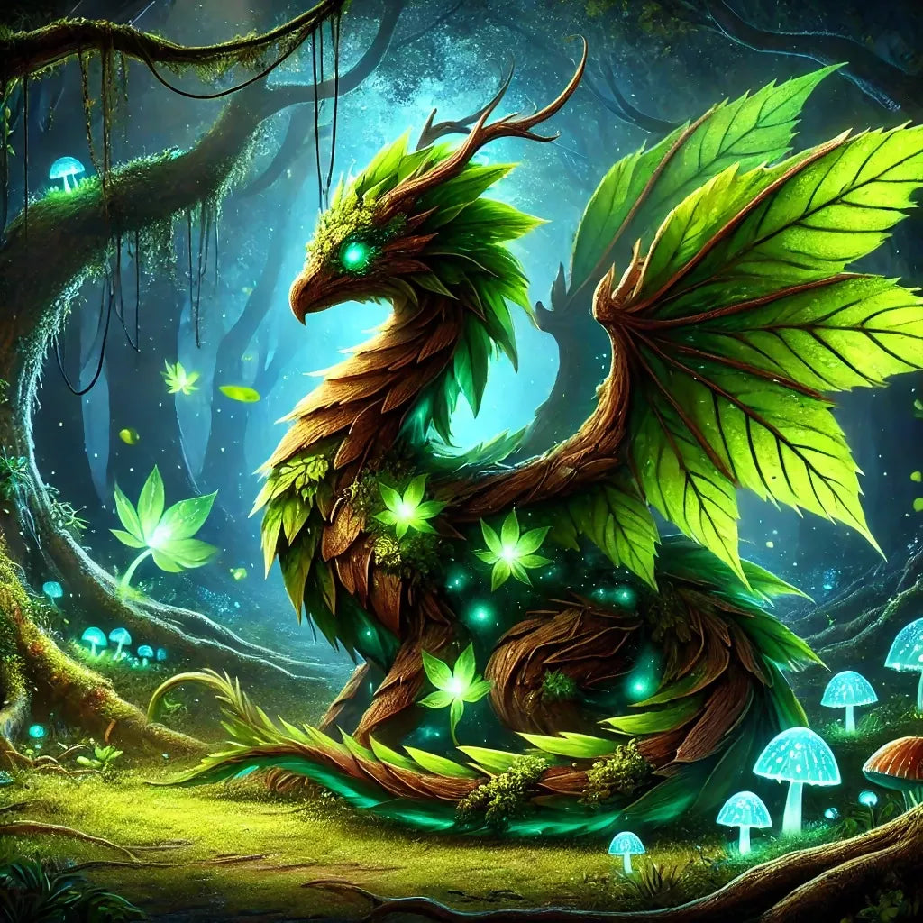 A majestic forest dragon made of wood and leaves, glowing with mystical green energy, rests in an enchanted woodland surrounded by luminous mushrooms and ethereal light.
