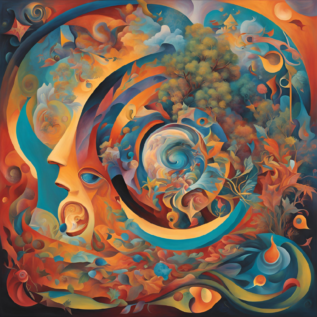 The swirling, fluid forms, vibrant colour palette, and dreamlike composition suggest elements of psychedelic and fantasy art as well.