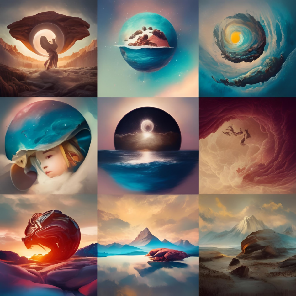 A mesmerizing collection of surreal digital artworks, each image blending cosmic and dreamlike elements. These scenes depict floating orbs, celestial landscapes, fantasy environments, and mysterious figures, evoking otherworldly narratives and a deep sense of wonder. The artwork combines futuristic, mystical, and natural themes in a harmonious visual experience.