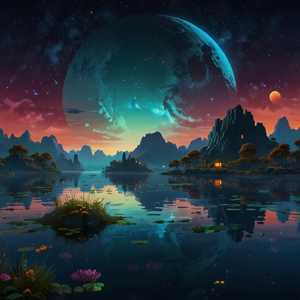 This breathtaking work of digital art features luminous floating islands suspended beneath a giant moon, surrounded by radiant bioluminescent flora and reflected in a tranquil, glass-like lake. Vibrant colors and soft ambient lighting create a dreamlike ambience, both supernatural and soothing.
