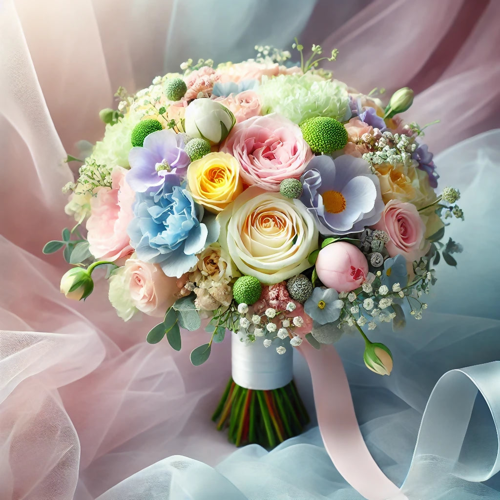 A close-up of a romantic bridal bouquet showcasing soft pastel tones of blue, pink, yellow, green, and purple. The arrangement features elegant roses, delicate peonies, and whimsical baby's breath, tied together with a satin ribbon. Set against a blurred background reminiscent of flowing silk or tulle, this image captures the essence of romance and timeless elegance, perfect for celebrating the beauty of love.