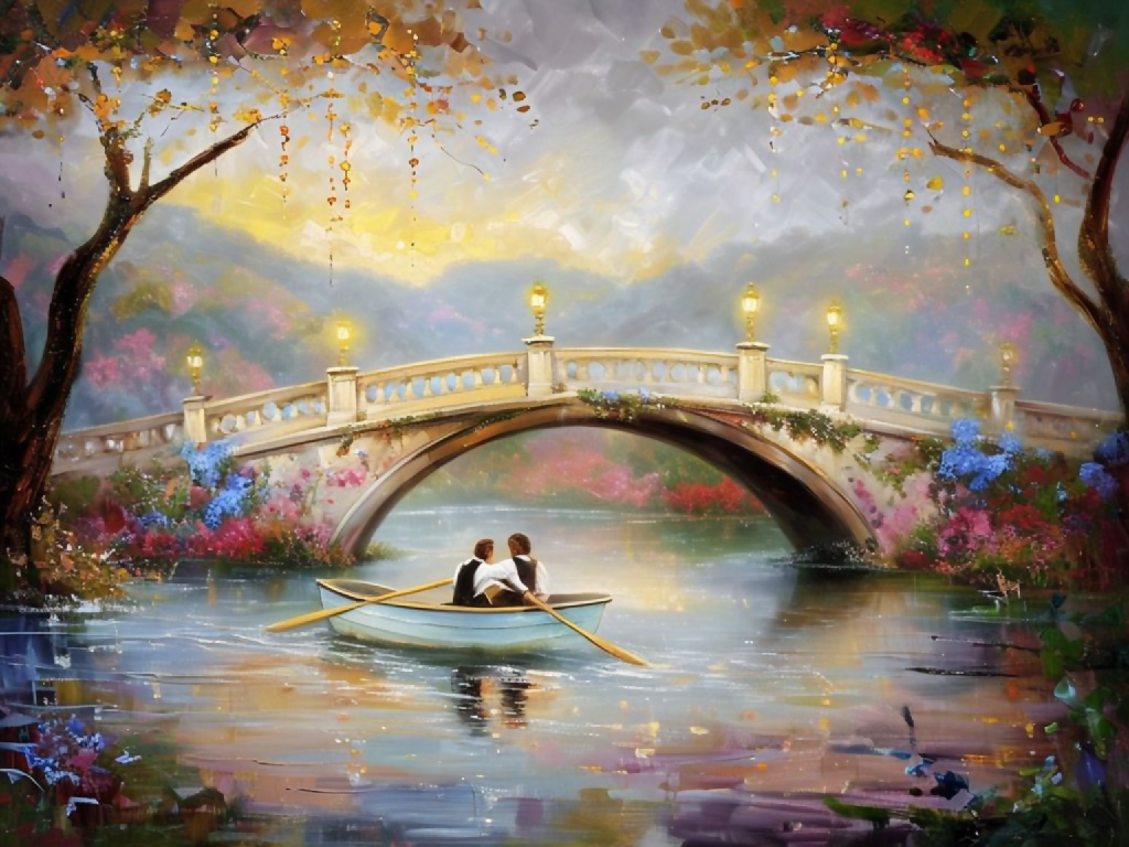 Step into a scene of enchanting romance with this dreamy bridge landscape digital art print, a romantic couple's rowboat painting that radiates timeless charm. This high-quality digital download features a loving couple gently rowing a boat under a beautiful arched bridge, illuminated by warm, glowing lanterns. The serene water reflects the soft light, while lush foliage and vibrant flowers adorn the bridge and banks, creating an impressionistic evening scene. Perfect for romantic home decor, wedding gifts, anniversary celebrations, or adding a touch of classic beauty to any space.