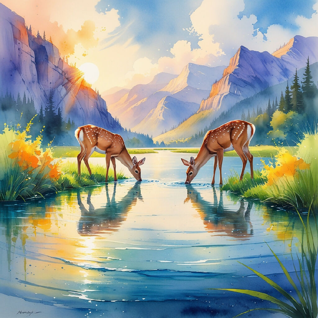 *"A serene watercolor painting of two elegant deer drinking from a crystal-clear river, reflecting the golden hues of the morning sun. The deer's fur is delicately painted with warm brown and soft beige tones, with subtle shading to capture the gentle texture of their coats. Their graceful reflections shimmer on the water's surface, adding a dreamy touch. The river flows calmly, painted with layers of translucent blues and greens, accented with white highlights for a natural glistening effect.