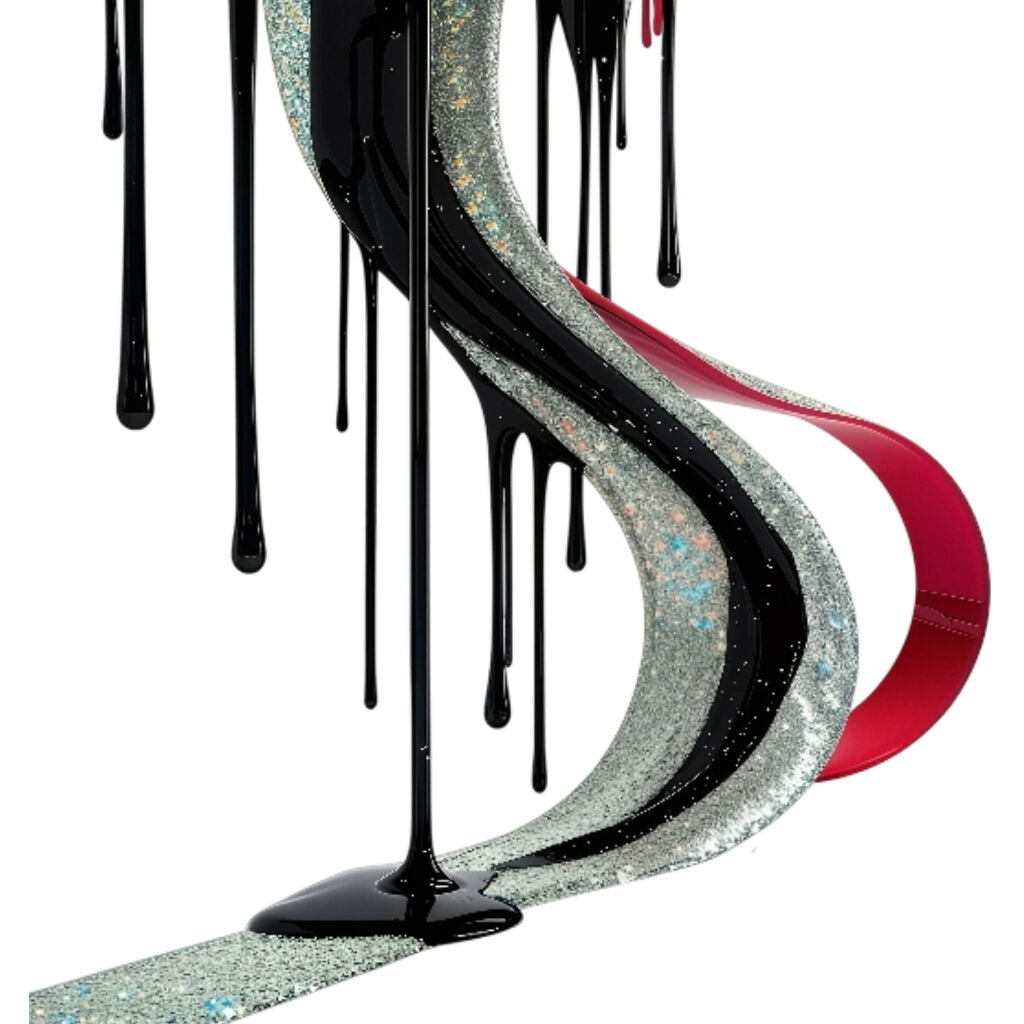 A trails of metallic gold and black paint drip luxuriously down a canvas, creating a refined, dramatic statement piece.