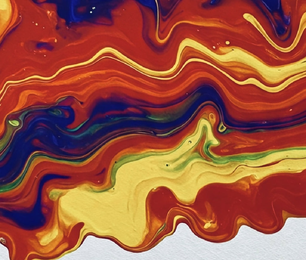 Red, yellow, purple, and green paint slowly dripping down a canvas.