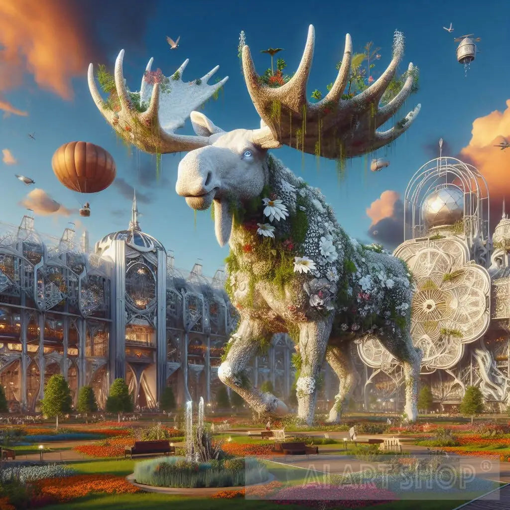 This is a surreal image of a giant moose made of flowers and plants in a fantastical garden. The moose has large antlers that are covered in greenery and flowers. The moose is standing on its hind legs and appears to be walking. The background is a fantastical garden with a variety of plants, flowers, and structures. There are hot air balloons and flying machines in the sky. The colors are vibrant and the mood is dreamlike. The moose is not an ordinary moose, but a droid moose, a robotic creature that mimics the appearance and behavior of a moose. The droid moose is exploring and enjoying the beauty and wonder of this blooming garden. This photo is a creative and whimsical expression of the artist’s imagination and love for moose and technology. It invites the viewer to admire and appreciate the floral fantasy of a moose.