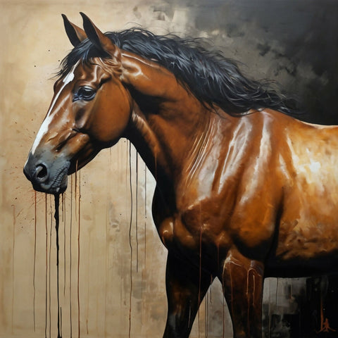 This painting showcases a horse with a glossy chestnut coat, set against a neutral background of browns and blacks. The horse’s mane appears windswept, adding a sense of motion and vitality. The artwork blends realistic depiction with abstract elements, particularly noticeable in the paint drips below the horse’s head, creating a melting effect. This piece is a beautiful example of modern equine art, combining realism with abstract techniques.