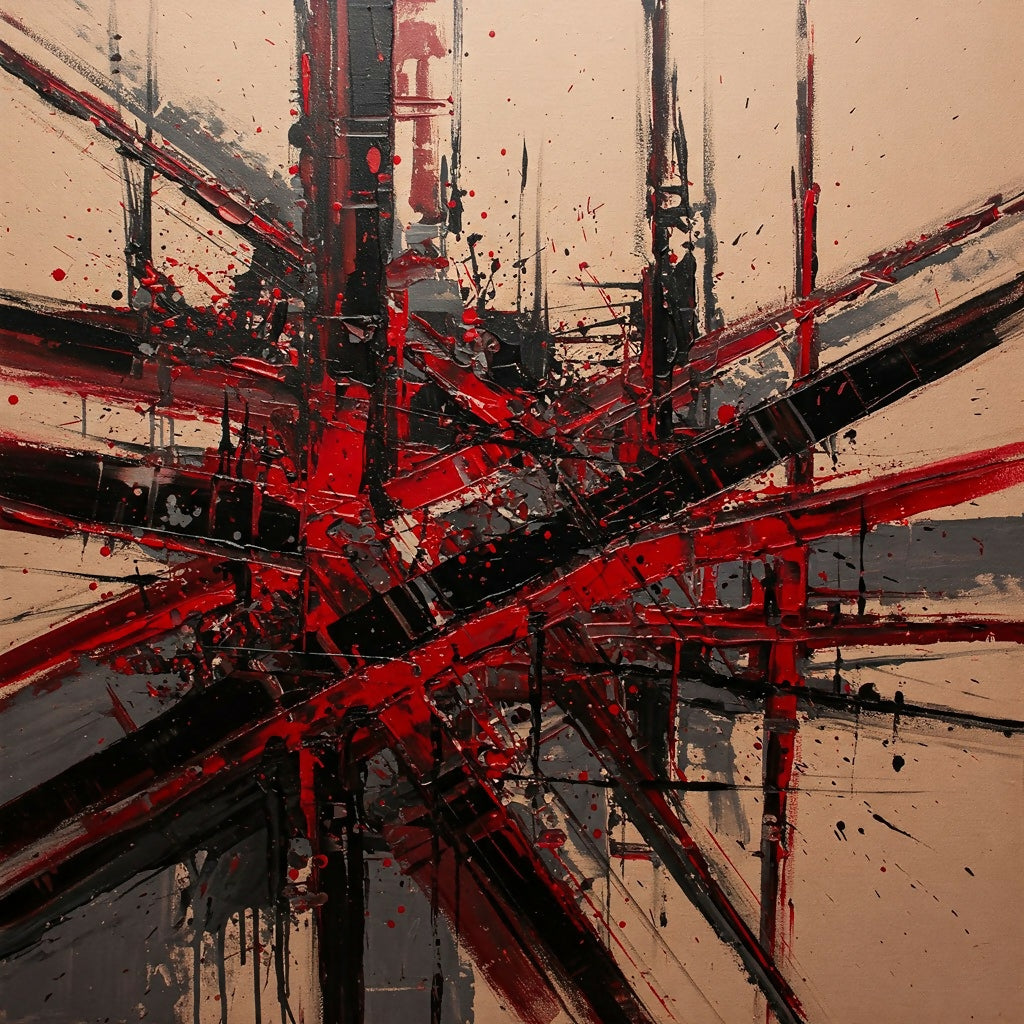 This is a dynamic abstract painting characterized by a bold and energetic composition. Layered, thick, gestural brushstrokes and splatters of color dominate the canvas, primarily in shades of red, black, grey, and beige. The application of paint is visceral, creating a strong sense of movement and texture through visible drips and splatters. Lines and shapes intersect and overlap in a complex interplay of forms, resulting in a modern, non-representational style. The overall effect is dramatic and expressive, conveying a sense of intensity and raw emotion. The painting fills the entire frame, lacking a traditional focal point, inviting the viewer to explore the intricate details and energetic application of paint. While purely abstract, the suggestive nature of the intersecting lines and shapes hints at underlying urban or architectural themes, without resorting to literal representation. This piece is a powerful exploration of color, texture, and dynamic form.