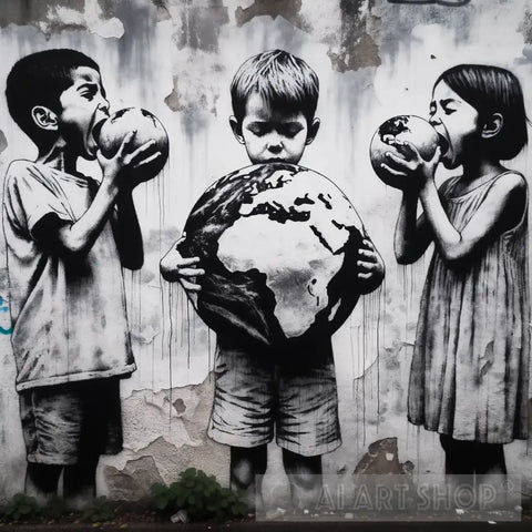 Ponder upon a poignant social message with this evocative artwork. Stark monochromatic sketches of children cradle the planet Earth, urging us to protect and preserve our environment for future generations.
