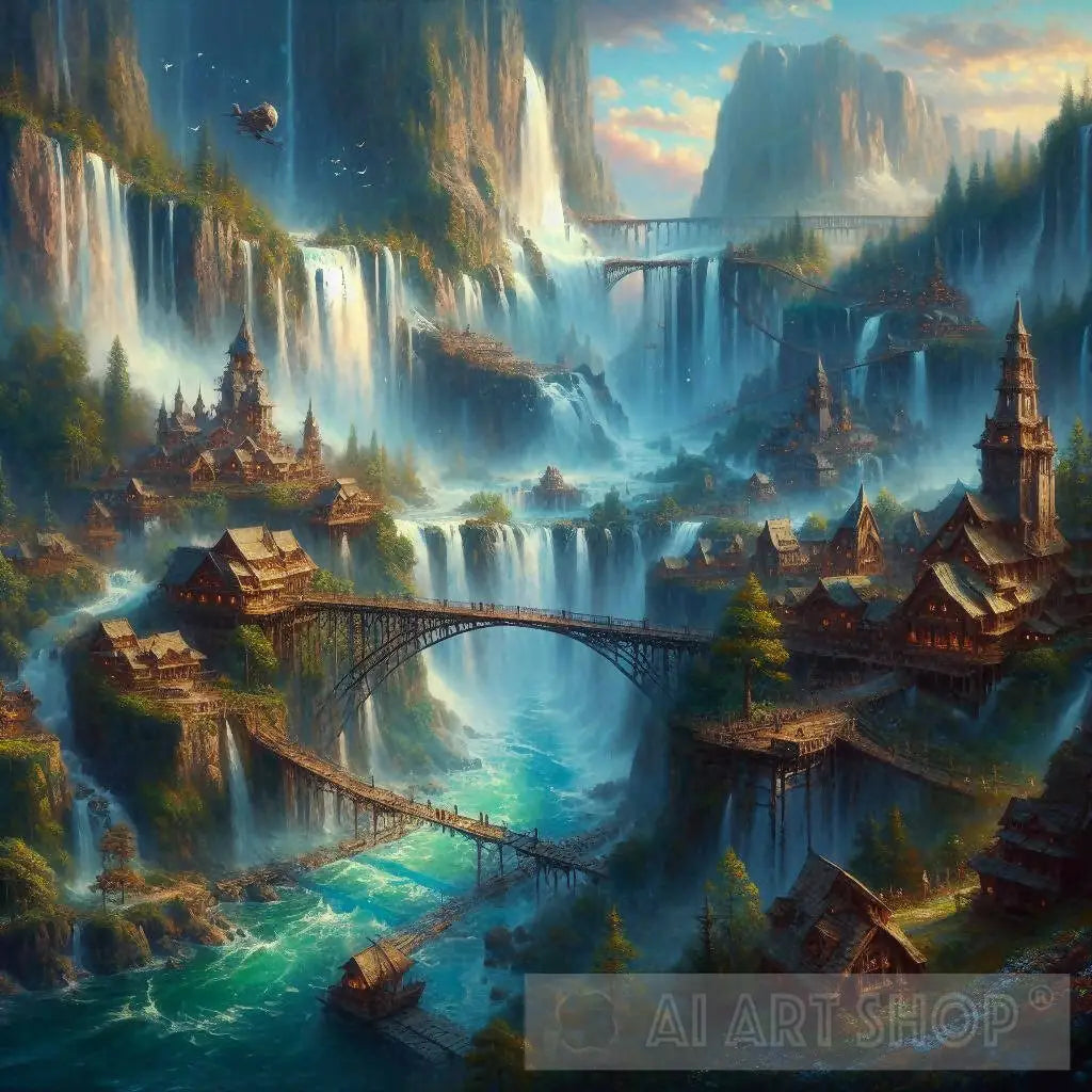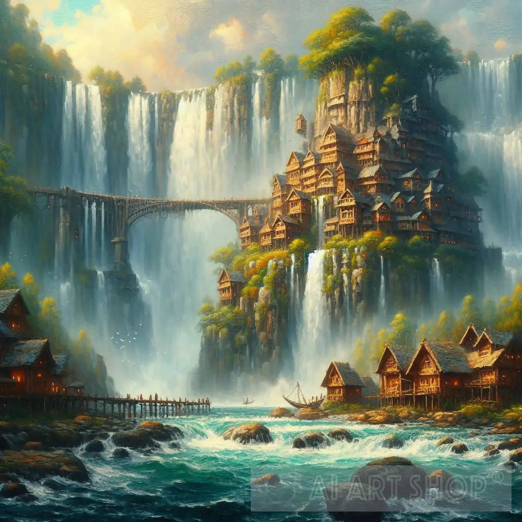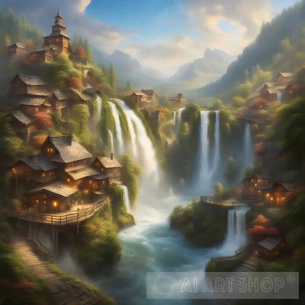 Fantasy, impressionist breathtaking view of waterfalls in a town made of wood