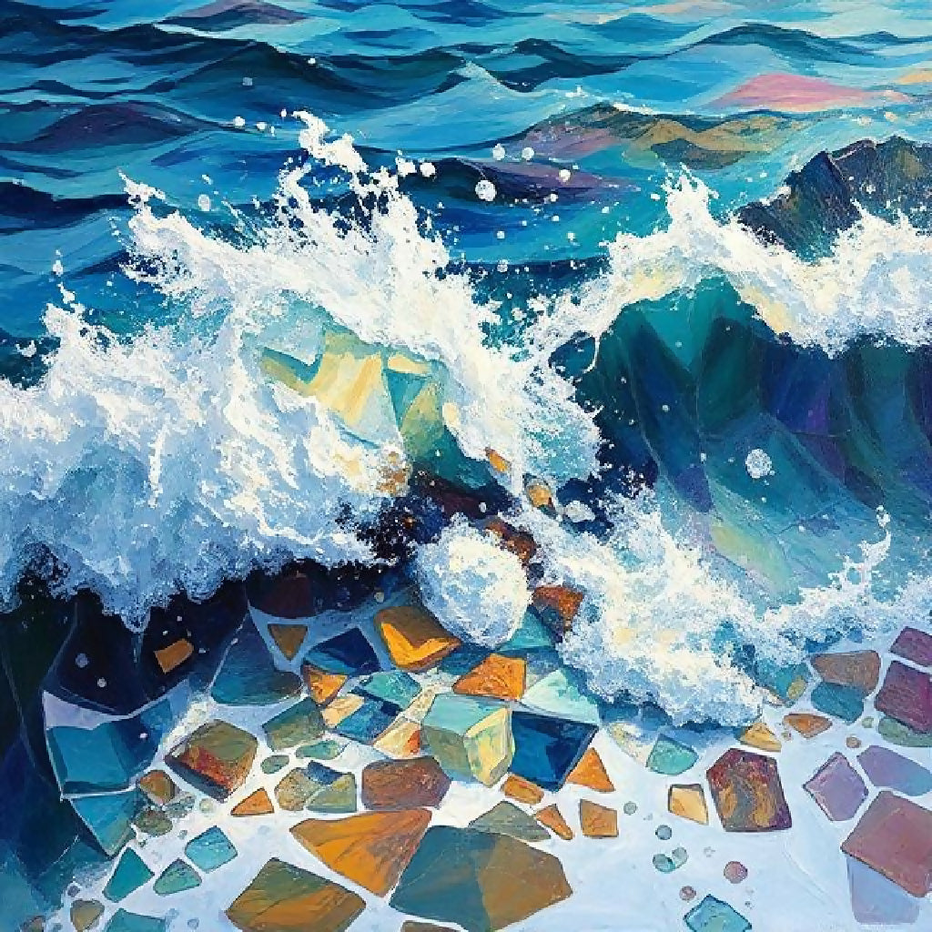 "A dreamlike painting of ocean waves breaking into fragments of glass, each shard reflecting echoes of laughter, sorrow, and silence, carried away by the tide."