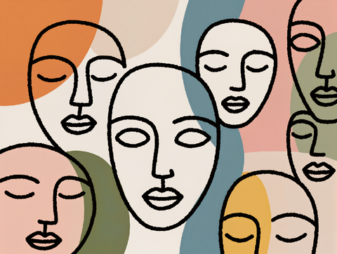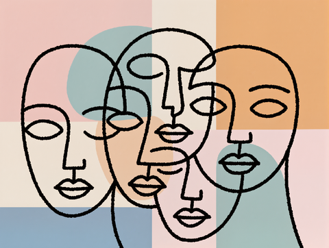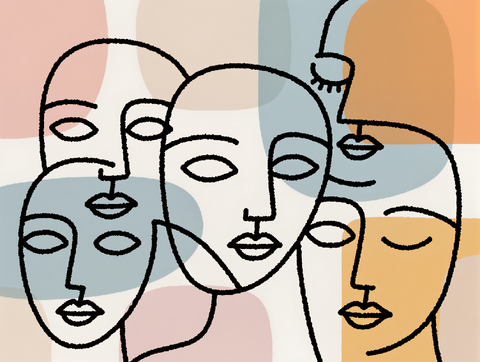 This poster features overlapping abstract faces in a dreamy pastel palette, inviting calm reflection and visual intrigue.