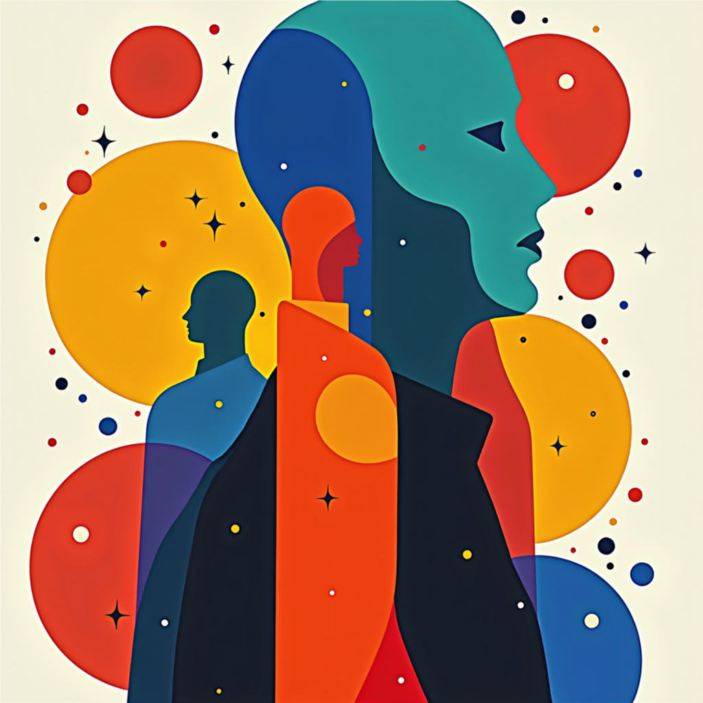 - Large circles—sun- and planet-sized—sit behind each figure, overlapping them in places to suggest layers of memory or identity.