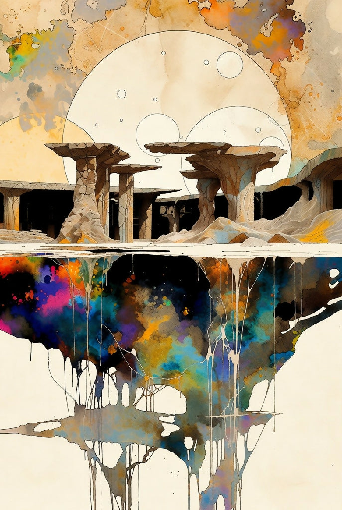 A visual journey that transcends the boundaries of reality. A unique abstract artwork that blends watercolor artistry with enigmatic geometric compositions. Through the interplay of vibrant colors against a calm, sandy background and fine, galaxy-like details, this piece stands as a true conversation piece, adding philosophical depth and unconventional beauty to any wall it adorns.