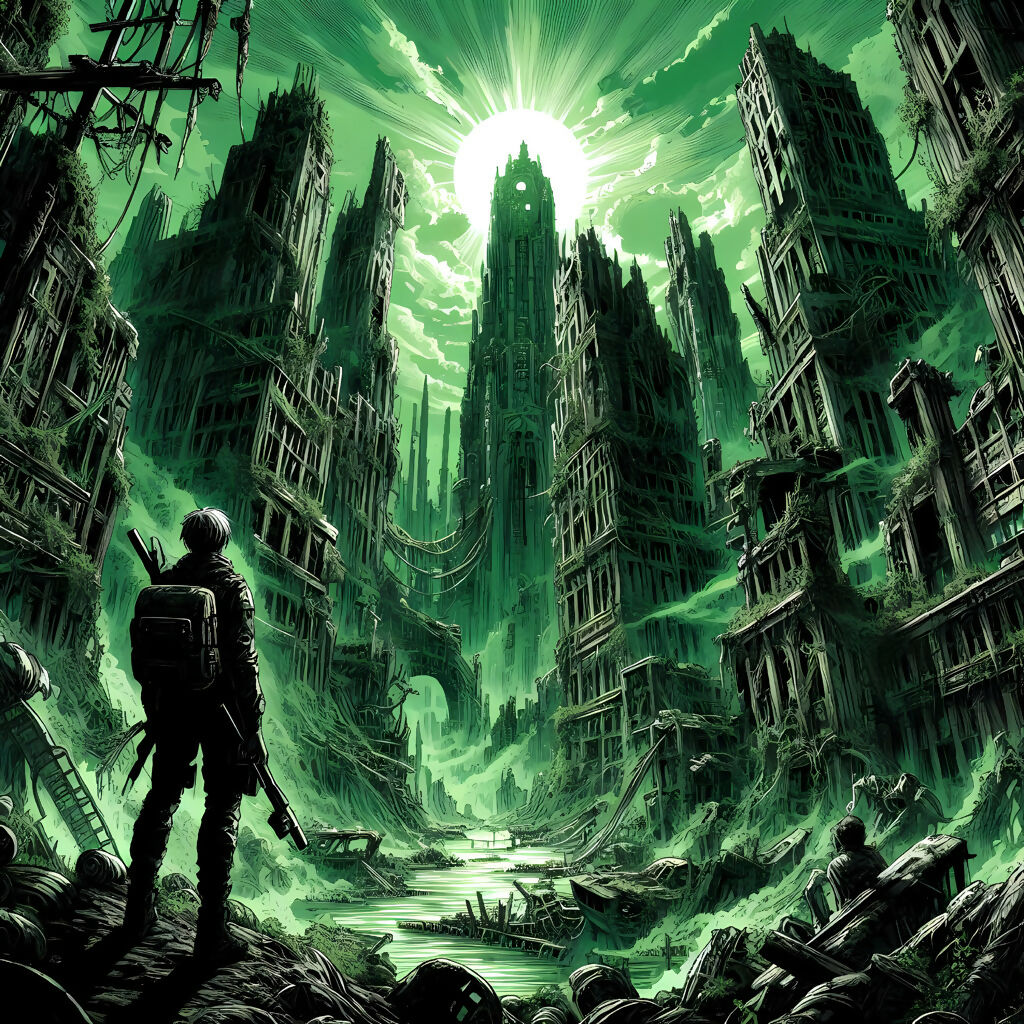 Step into a haunting future where civilization has crumbled and nature reclaims the ruins. Echoes of Oblivion captures a lone survivor standing amidst towering, decayed skyscrapers bathed in an eerie green glow. The glowing monolith in the distance hints at a forgotten power source—or perhaps a beacon of hope. This AI-generated artwork evokes themes of isolation, resilience, and the remnants of human ambition. Perfect for sci-fi lovers, futurist collectors, and fans of atmospheric storytelling.