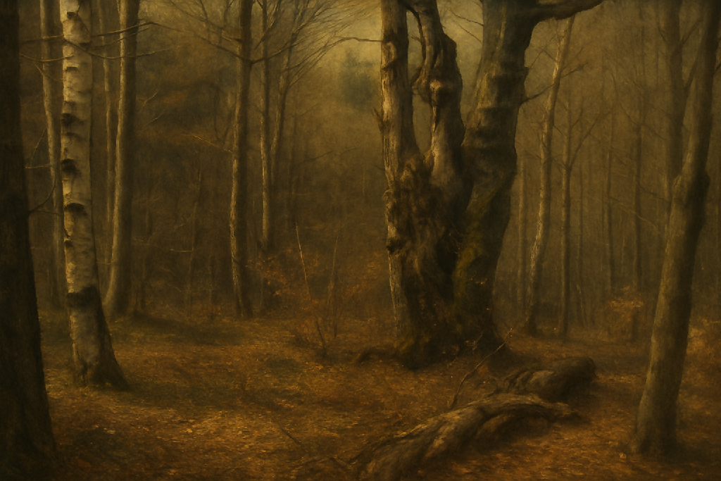 A nostalgic oil painting in the style of 17th-century Dutch masters, depicting a quiet forest where time seems to have paused. The gnarled central tree, wrapped in shadow and moss, stands as a monument to memory and silence. Gentle light filters through bare branches, revealing the quiet poetry of nature's stillness. This piece evokes a longing for the forgotten woods of old, where each tree tells a forgotten story.