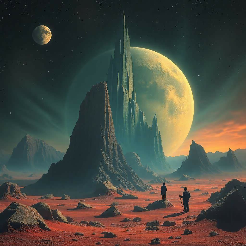 Two explorers stand on the crimson surface of an alien world, dwarfed by towering, jagged rock formations that rise dramatically toward the sky. In the background, a colossal planet looms with a glowing aura, casting an ethereal light over the surreal landscape. Distant moons and a star-speckled sky add to the sense of otherworldly mystery, evoking the feeling of an epic journey into the unknown.