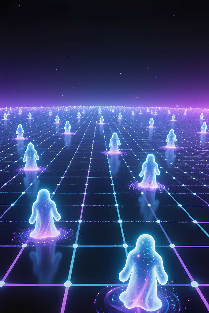 Digital spirits floating in a 3D data network.