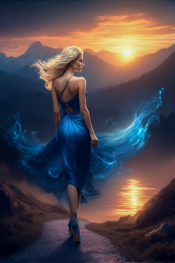 She is adorned in a stunning blue dress that seems to dissolve into shimmering, luminous tendrils of energy, suggesting a magical or otherworldly quality. The vibrant blues of her attire and the glowing wisps contrast beautifully with the warm oranges and purples of the setting sun, which casts a radiant glow over the distant mountains and reflects golden streaks across the water's surface. The overall atmosphere is one of serene enchantment, with a touch of power and elegance, as if the woman is intrinsically connected to the natural magic of her surroundings. This artwork is ideal for those who appreciate themes of fantasy, mystique, and striking feminine grace in a breathtaking landscape.