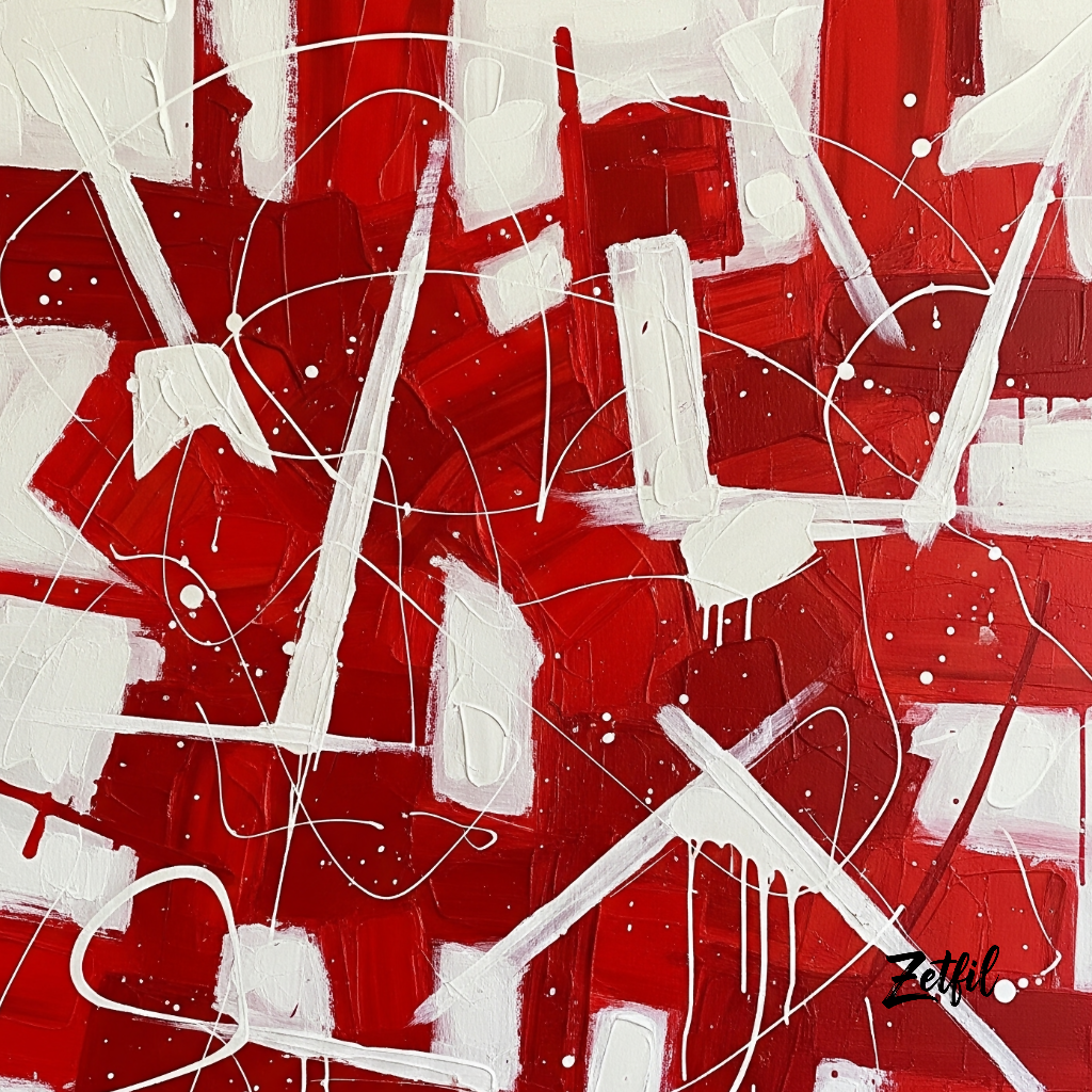 Les tons dominants de rouge vif évoquent la passion, l'amour et l'énergie, tandis que le blanc pur apporte un équilibre et une touche de lumière. Les textures riches et les éclaboussures aléatoires ajoutent de la profondeur, rendant chaque coup d'œil unique.