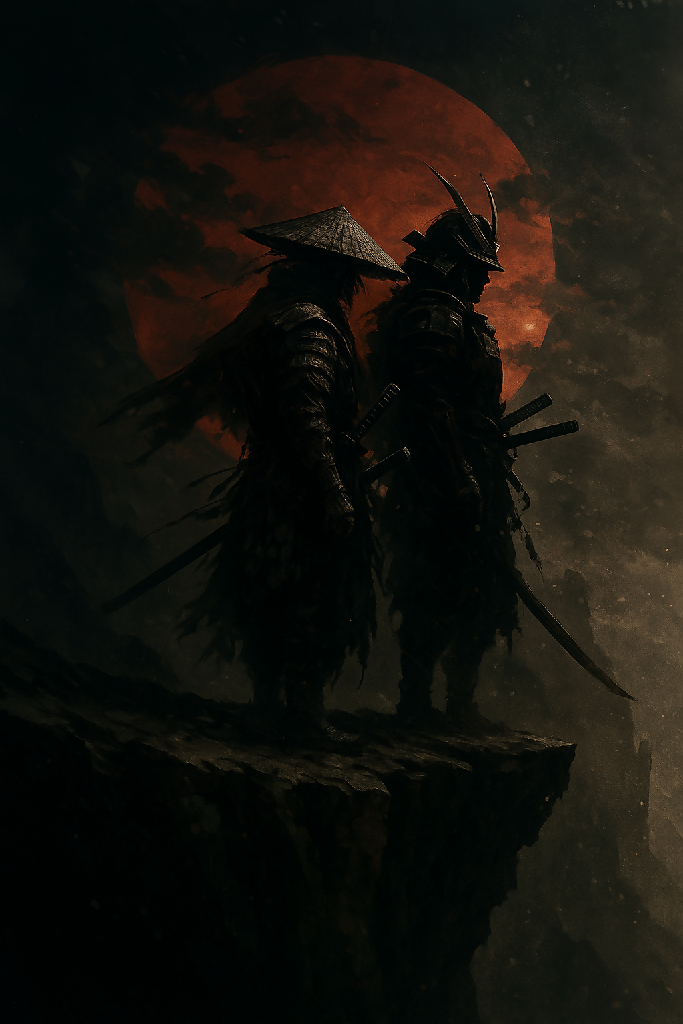 Their swords, sheathed yet ever-present, reinforce their identity as warriors, their code of bushido echoing through the silent wind. The blood-red sun looming behind them is not just a backdrop — it symbolizes fading glory, conflict, and perhaps an approaching reckoning. The textures in the sky and cliffside evoke turmoil and the harshness of their world, further enhancing the epic and grim tone of the piece.