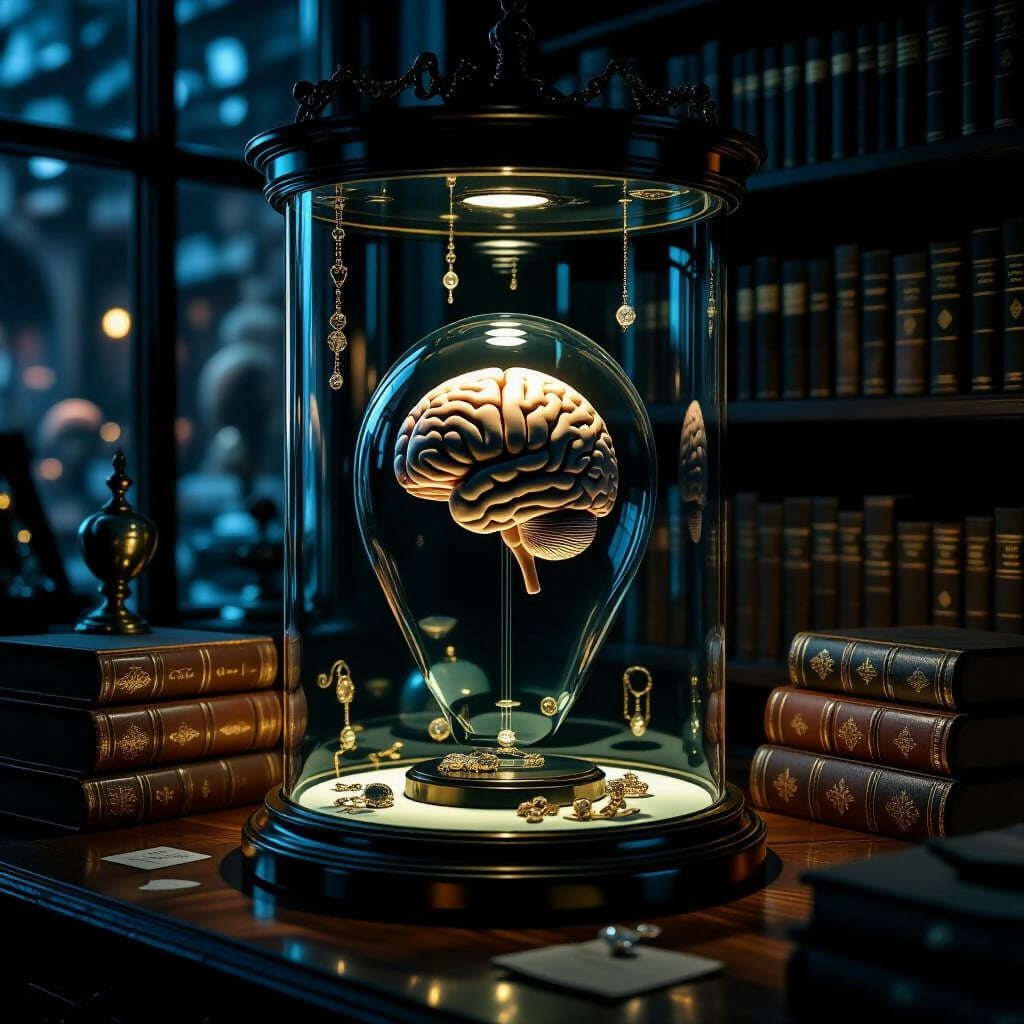 This image shows a glowing glass display case with a human brain inside, set in a dimly lit antique shop at night. The scene evokes a dark, cinematic aesthetic.