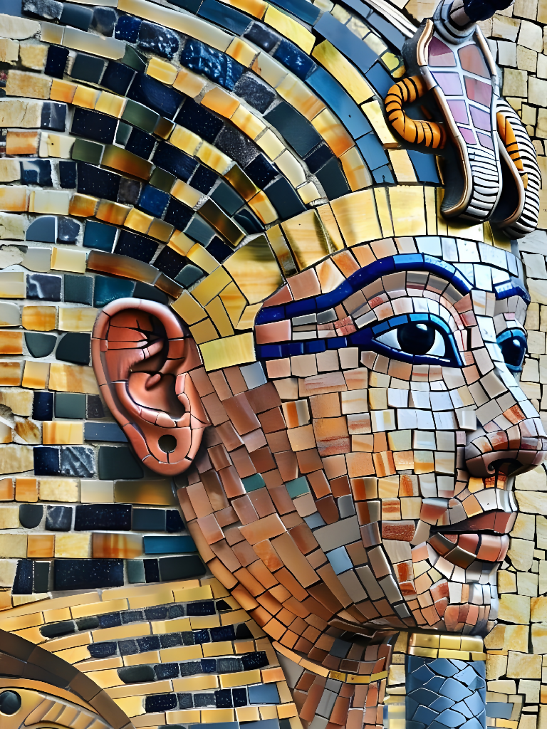 A captivating mosaic art piece inspired by ancient Egyptian culture, featuring the iconic face of Pharaoh Tutankhamun. This intricate design showcases vibrant colors, detailed patterns, and a unique tile texture that brings history to life. Perfect for lovers of Egyptian art, history enthusiasts, and those seeking a bold and cultural digital artwork for wall decor, prints, or unique gifts.