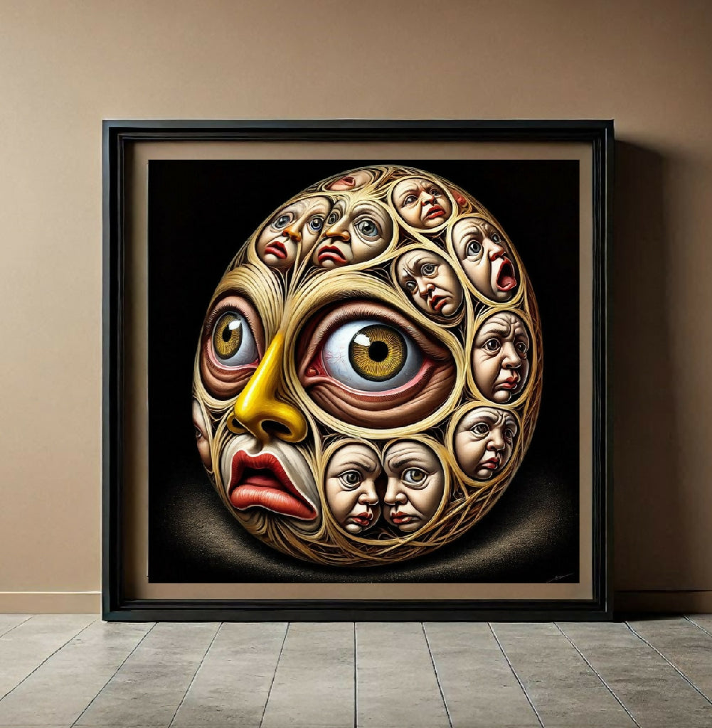 Ein Ei, dessen Oberfläche mit zahlreichen kleineren Gesichtern bedeckt ist, die verschiedene Emotionen ausdrücken, wie z. B. Trauer, Wut, Angst und Überraschung. Ein größeres Gesicht steht im Vordergrund zu sehen und dominiert die untere Hälfte. Die Farben sind hauptsächlich Beige, Braun und Gelb, mit einigen Akzenten in Rot und anderen Farben. Das Gesamtbild wirkt surreal und etwas beunruhigend.