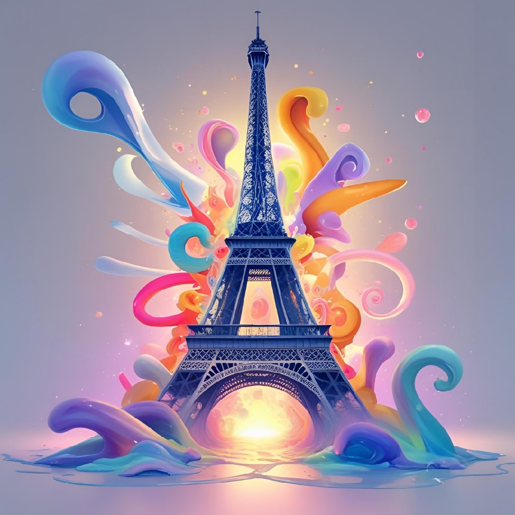 "Eiffel Tower 2" presents a vibrant and fantastical interpretation of the iconic Parisian landmark. The Eiffel Tower, rendered in a deep blue or indigo hue, stands centrally, illuminated from within its base by a warm, golden glow. Surrounding the tower is an explosion of fluid, colorful abstract shapes that appear to be swirling and flowing outwards. These organic forms are in a diverse palette of bright blues, purples, pinks, oranges, and yellows, suggesting a dynamic, almost liquid or gaseous eruption. There are also scattered spheres or bubbles in similar bright colors, adding to the playful and dreamlike atmosphere. The base of the tower seems to be emerging from or reflecting in a pool of luminous, multicolored liquid. The overall impression is one of celebration, magic, and artistic whimsy, transforming the historic structure into a beacon of vibrant energy.
