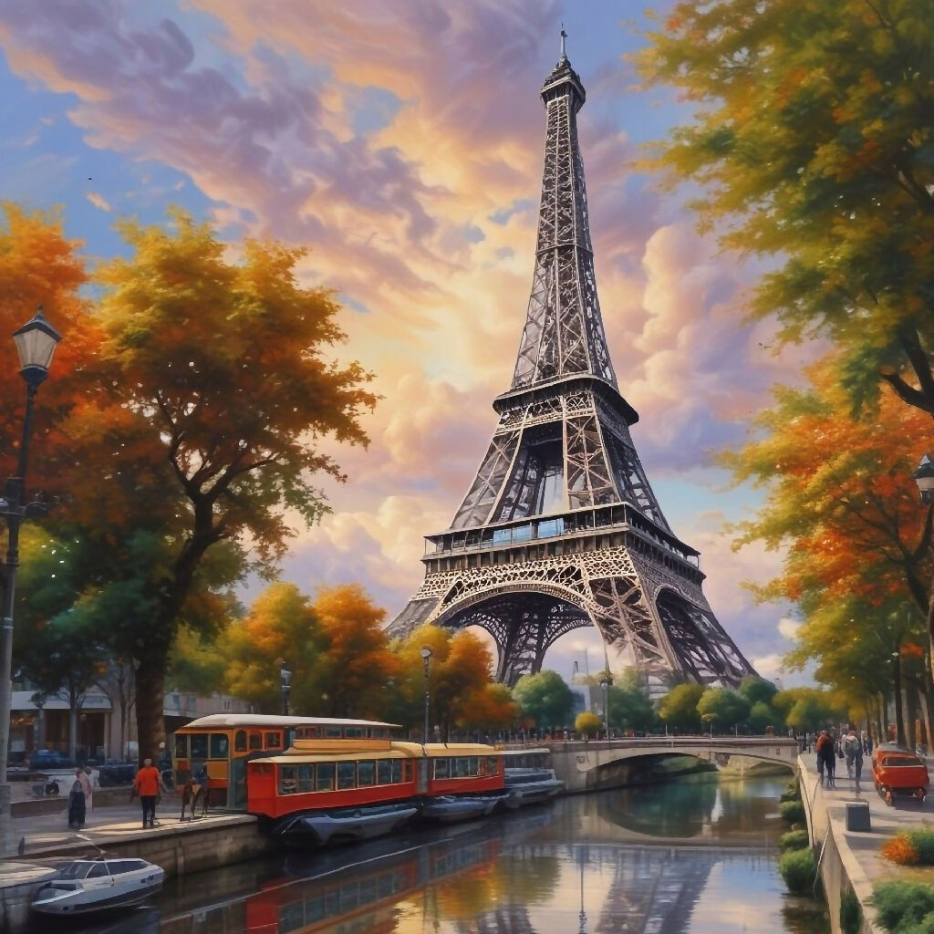 In the background, the Eiffel Tower rises majestically against the clear blue sky, and the sun shines on the iconic structure, illuminating it with a warm glow. This depiction captures the heart and soul of Paris – a city full of charm, culture and vibrant moments. It is an image that transports the viewer to the romantic and dynamic atmosphere of the city.
