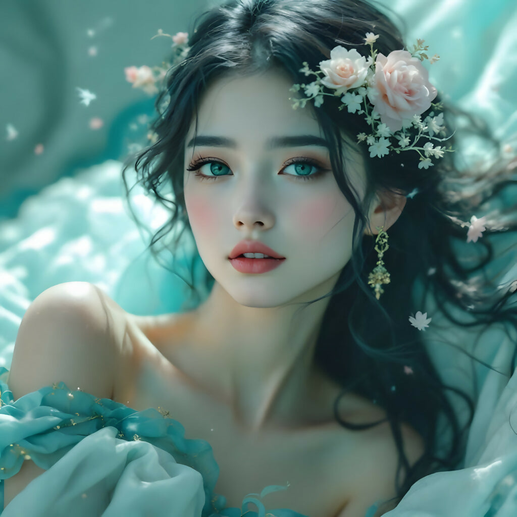 “Elaria” is the embodiment of calm, grace, and blooming softness. Her porcelain glow and aquamarine surroundings evoke the serenity of a gentle spring morning. Crowned with soft pink roses and tiny blossoms, her wistful gaze draws you into a realm untouched by chaos.