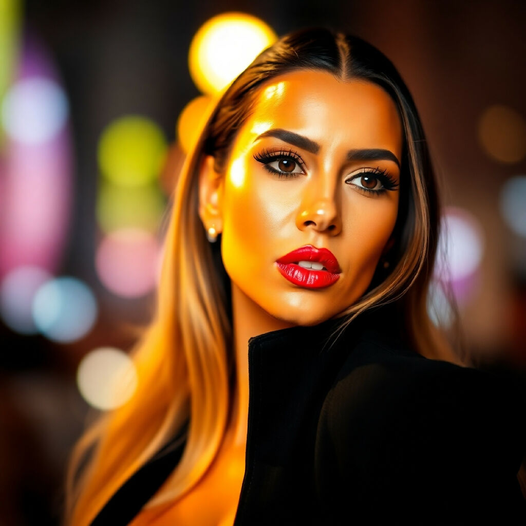 Electric Bokeh Blonde is a striking AI-generated portrait capturing a blonde-haired model in sharp focus against a vivid bokeh background. Electric tones and glowing contrasts bring energy and allure to this modern artwork.