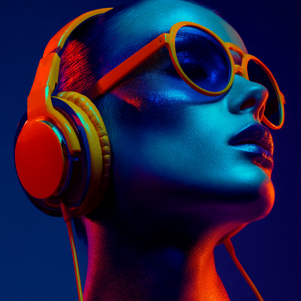 Tags: Headphones, Orange Headphones, Colorful Lighting, Music Portrait, Electric Vibes, Modern Aesthetic, Contrast Photography