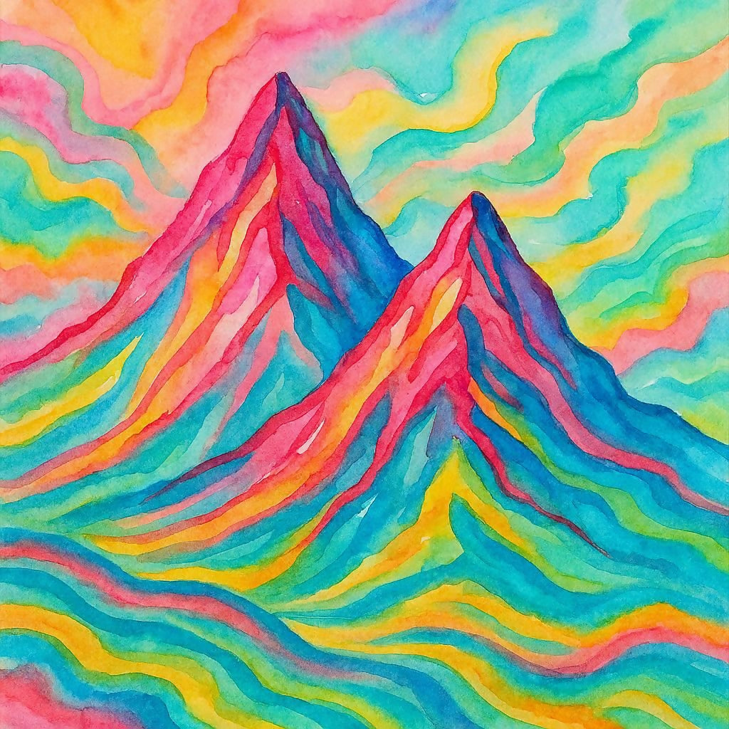 Experience the high-voltage beauty of Electric Peaks, a vibrant watercolor masterpiece that reimagines the traditional mountainscape. This artwork features towering, dual summits rendered in a psychedelic array of hot pinks, deep indigos, and electric ambers. The surrounding atmosphere is a swirling symphony of prismatic clouds and undulating valleys, creating a sense of constant, rhythmic movement.