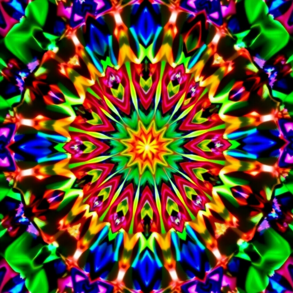 Explosive psychedelic kaleidoscope mandala bursting with electric neon colors - vibrant green, hot pink, electric blue, orange, and yellow radiating from a brilliant center. The symmetrical pattern creates a mesmerizing, trippy visual with glowing edges and intense fluorescent rainbow hues.