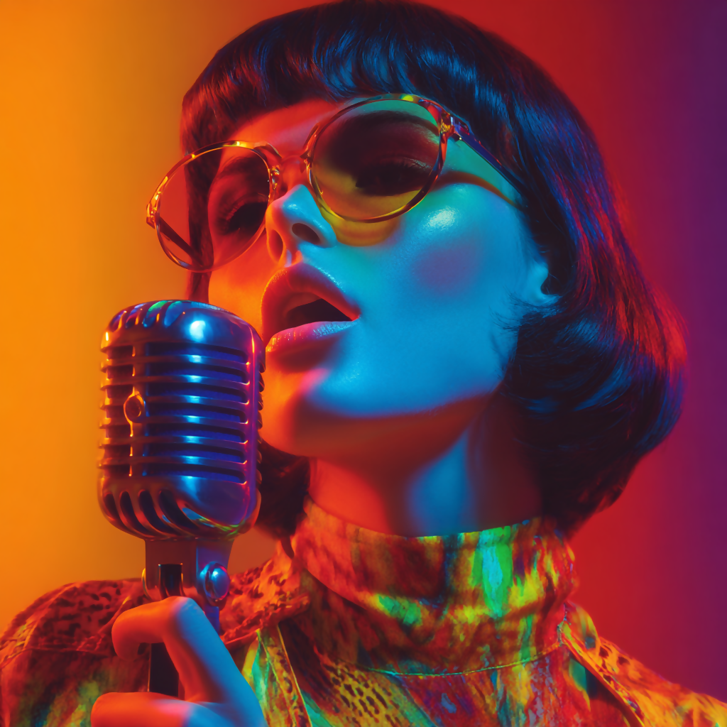 Tags: 60s pop singer, retro fashion, vintage microphone, psychedelic colors, mod style, artistic portrait