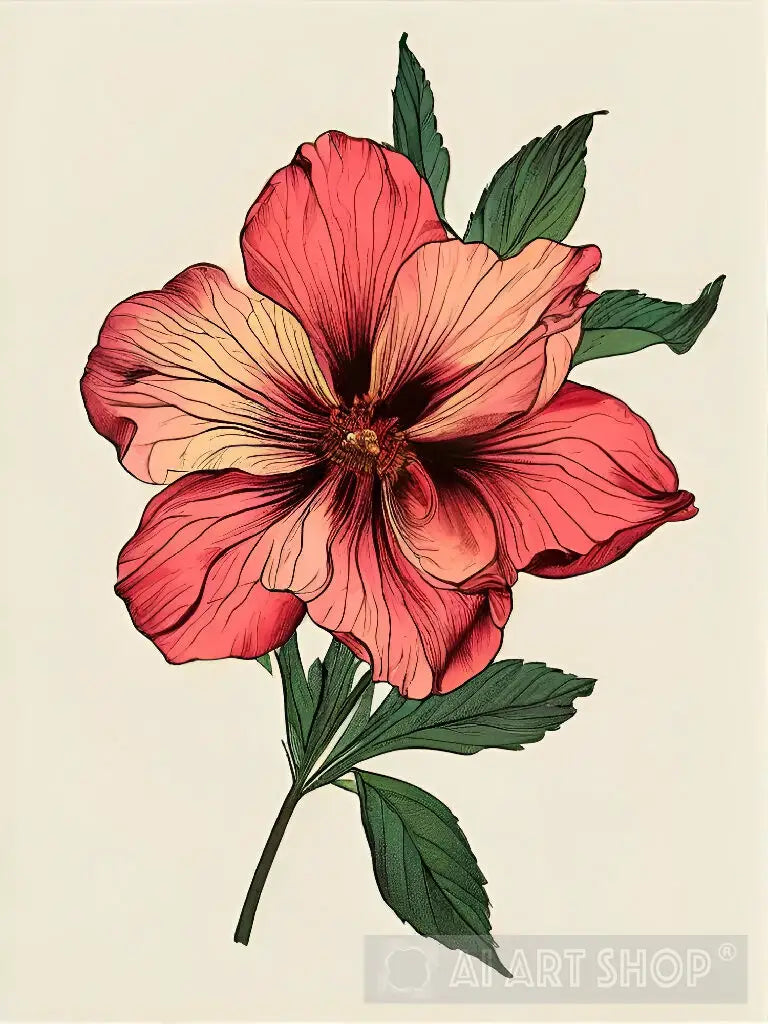 This captivating artwork showcases a stunning pink hibiscus flower in full bloom. The flower's delicate petals are contrasted by lush green leaves, all set against a crisp white background. This piece of AI-generated art is sure to add a touch of elegance and sophistication to any home or office.