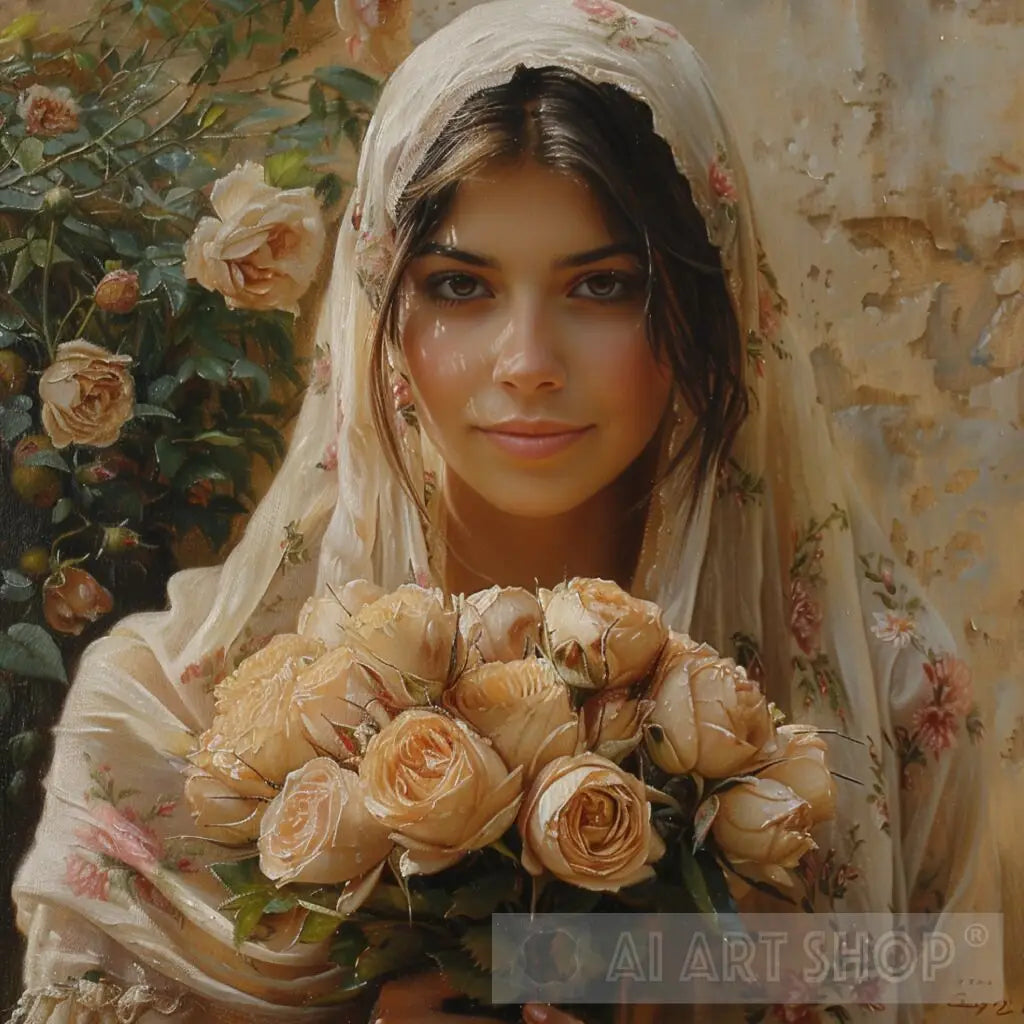This exquisite painting portrays a young woman clad in a delicate, floral-patterned veil, holding a bouquet of soft peach roses. Her gaze is gentle and inviting, with a subtle smile that suggests a serene disposition. The texture and detail in the painting are remarkable, from the lifelike rendering of her skin and the shimmer of light on her hair, to the intricate details of the roses and the fabric of her veil. The background, featuring a textured wall and more roses, complements her with a vintage, timeless aesthetic.