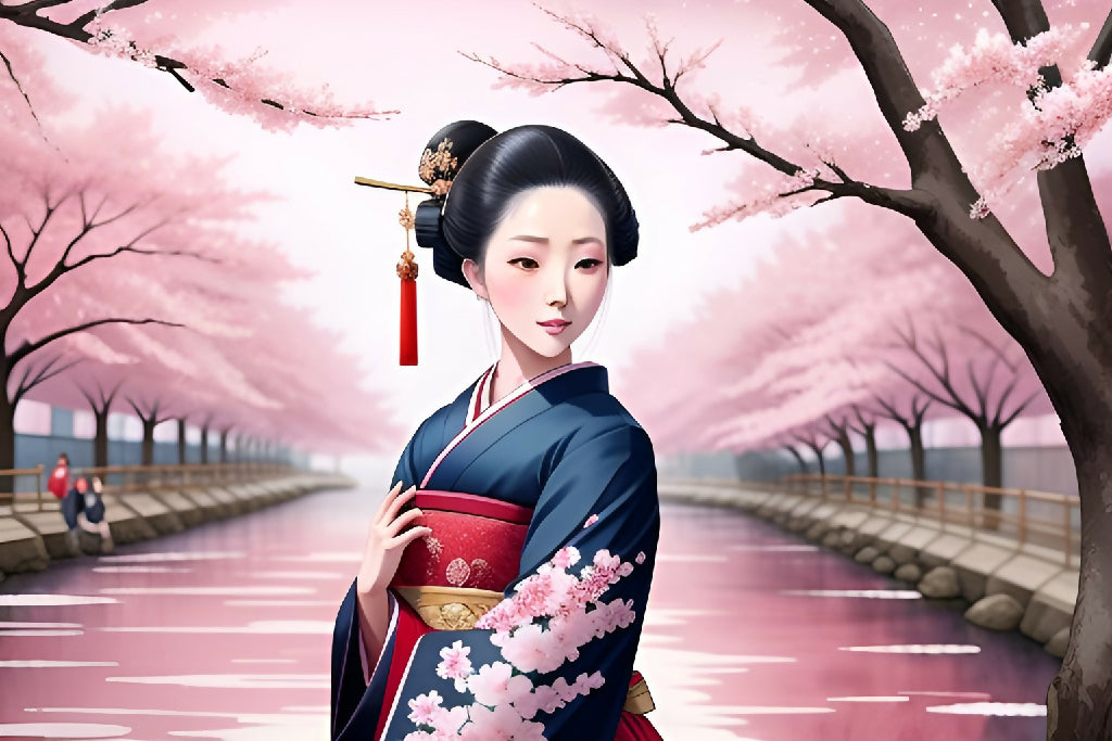 A woman is wearing a traditional kimono, which is a beautiful robe often associated with Japanese culture. The setting appears to be outdoors, highlighting the elegance of the clothing. The woman may resemble a geisha, known for their artistry and design.