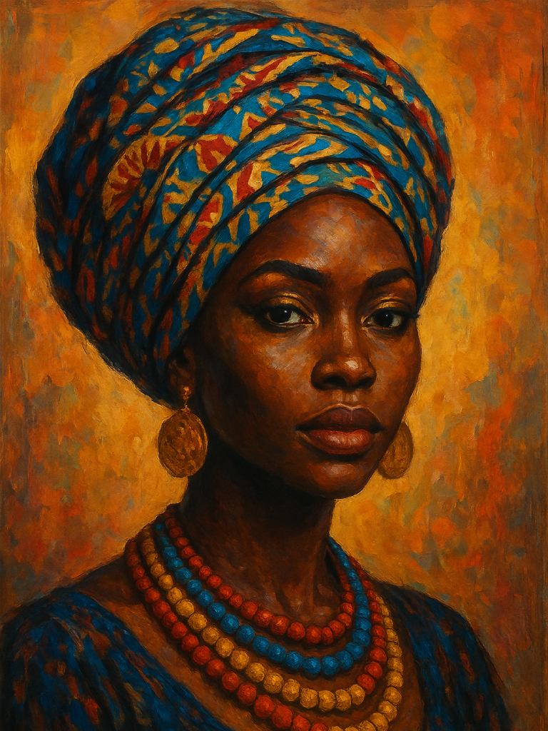 Elegant African Woman Portrait – Vibrant Tribal Headwrap Art Print, Afrocentric Wall Decor, Digital Painting for Home and Office
