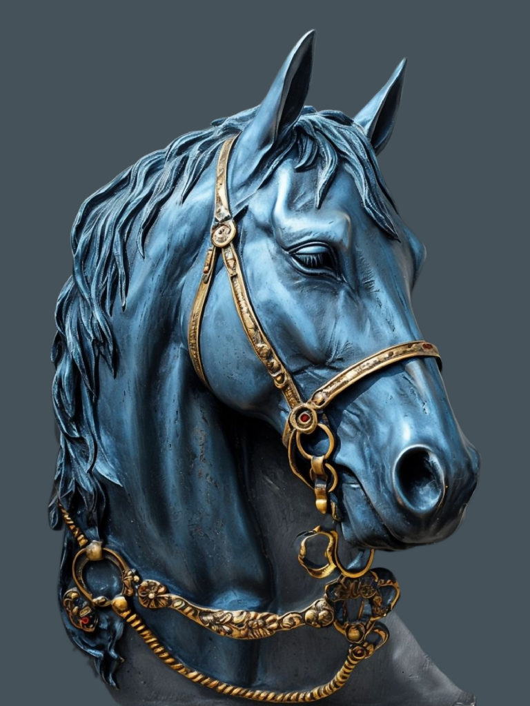 This stunning digital artwork showcases a detailed relief sculpture of a horse's head in a captivating blue tone. The intricate design highlights the horse's majestic features, complemented by luxurious golden accents on the bridle and reins. Perfect for equestrian lovers, art enthusiasts, or anyone looking to add a touch of sophistication to their digital collection. Ideal for use as wall art, prints, or as a centerpiece in creative projects.