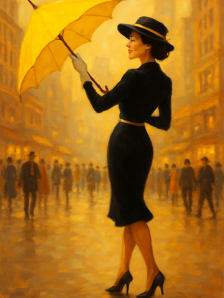 Elegant City Stroll Painting: Woman with Yellow Umbrella Digital Art Print