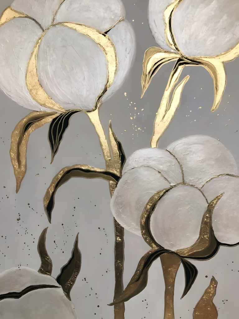 This stunning digital art print features elegant cotton flowers adorned with luxurious gold accents. The delicate white petals and shimmering metallic highlights create a sophisticated and modern design, perfect for enhancing any living space, bedroom, or office. Ideal for nature lovers and art enthusiasts, this unique piece blends minimalistic beauty with timeless elegance. Perfect for wall decor, it adds a touch of luxury and tranquility to any environment.
