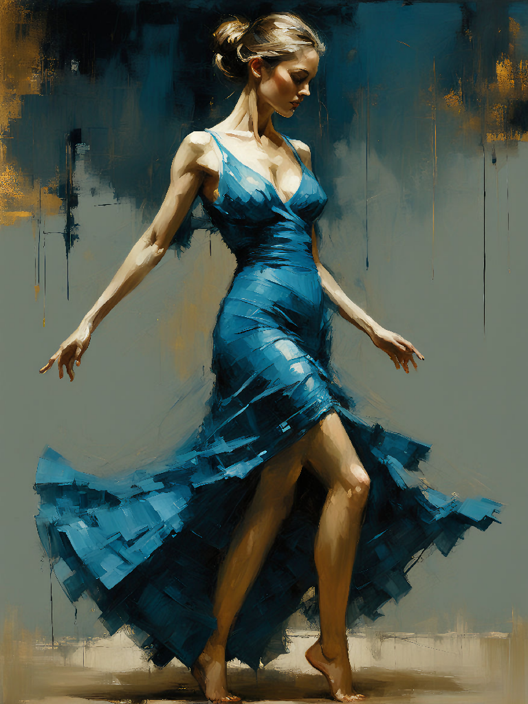 Dance of Light and Shadow, This stunning art print portrays an ethereal dancer in a flowing dress, captured in mid-motion. The impasto oil painting technique adds depth and texture, while the saturated colors and high contrast highlight her beauty and the fluidity of her dance.