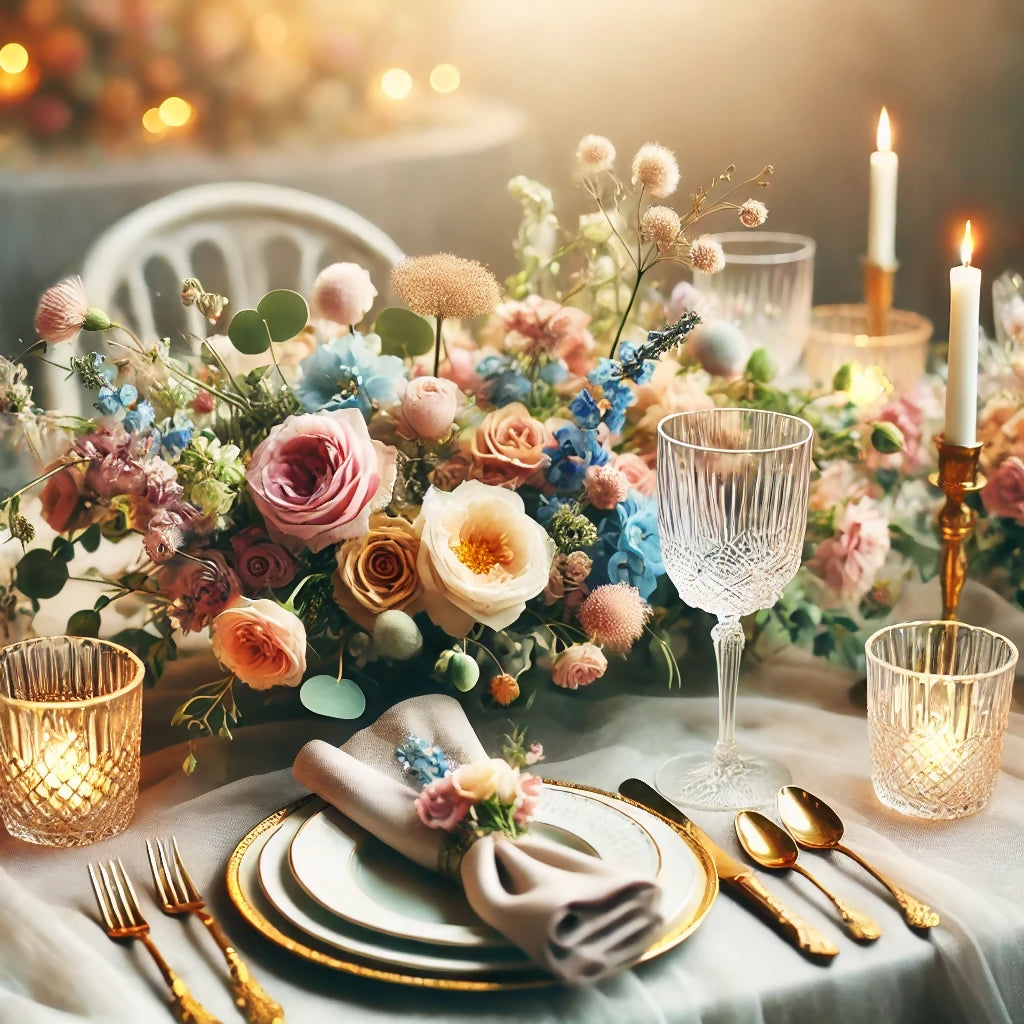 A stunning depiction of an elegant wedding table adorned with gold utensils, crystal glasses, and a floral centerpiece in soft pastel hues of pink, blue, green, yellow, and purple. The table features fine linen and is illuminated by the warm glow of candlelight, creating a romantic and dreamy atmosphere. Perfect for capturing the timeless beauty of a luxury wedding celebration.