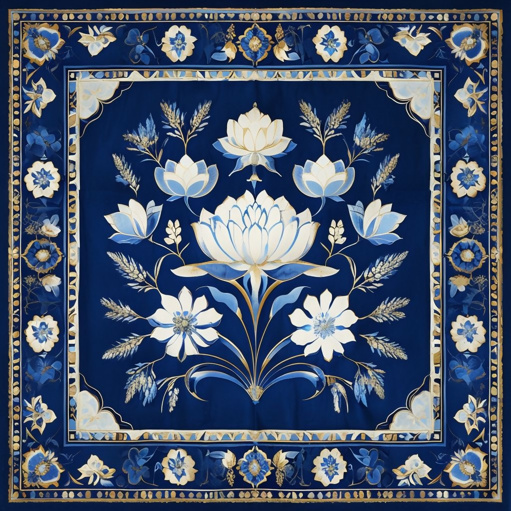 Discover the unparalleled elegance of this exquisite digital download, featuring a magnificent Aubusson-inspired design. Our high-resolution digital artwork showcases an ornate floral medallion motif, beautifully rendered in a sophisticated palette of royal blue and rich gold. This intricate pattern includes delicate lotus flowers and a stunning decorative border, making it a perfect addition to any upscale home decor or classic interior design scheme.
